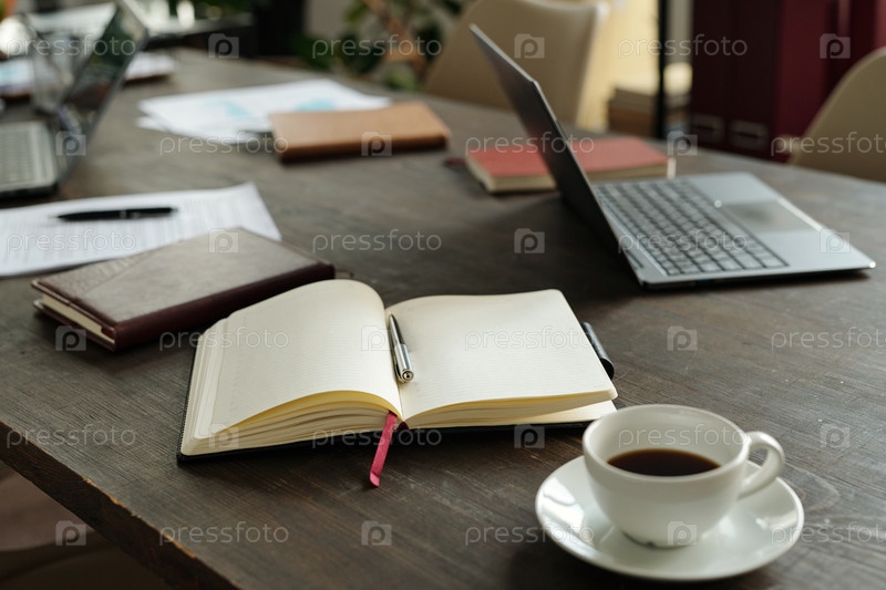 Верхний вид рабочего пространства с открытым ноутбуком, ноутбуком и чашечкой кофе