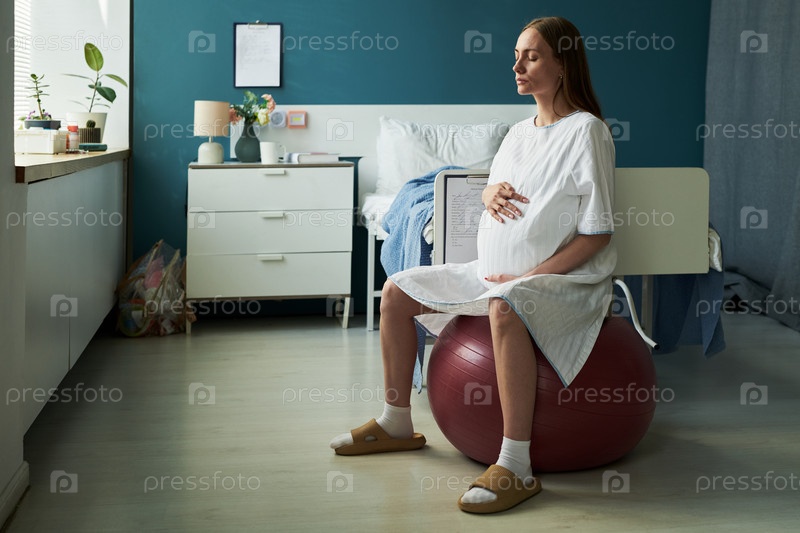 Беременная молодая женщина сидит на тренировочном мяче в больничной комнате