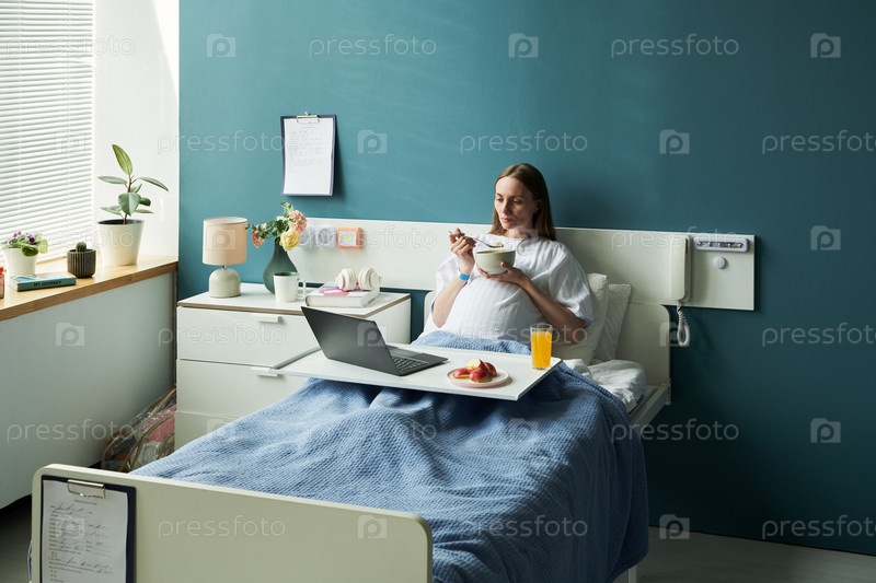 Молодая взрослая женщина ест завтрак, используя ноутбук в больничной постели