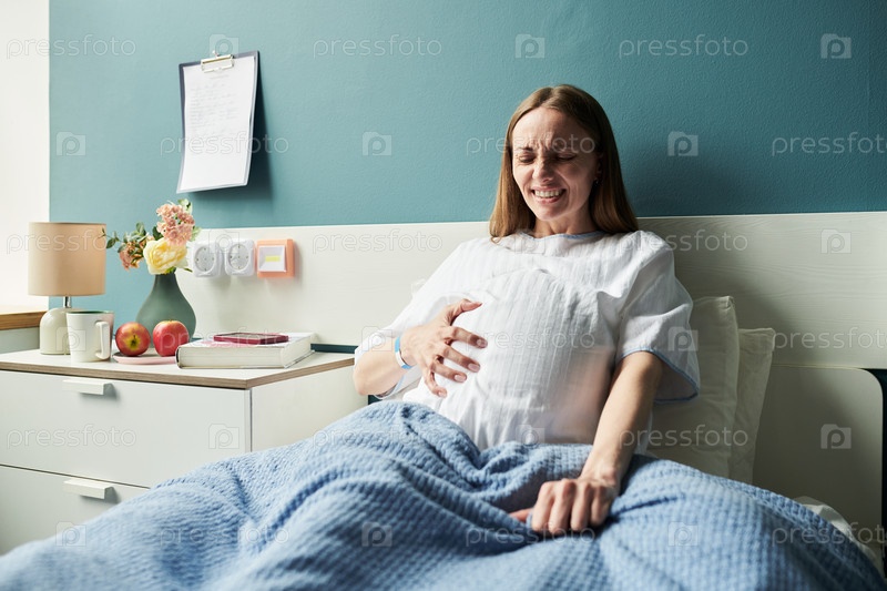 Молодая взрослая женщина, испытывающая боли в родах на больничной койке