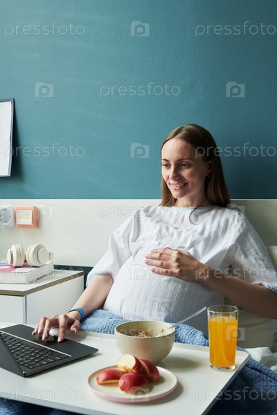 Беременная женщина использует ноутбук во время завтрака в больничной постели