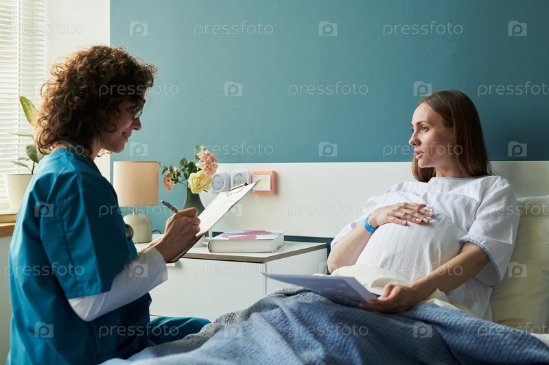 Беременная женщина разговаривает с медсестрой во время осмотра в больнице