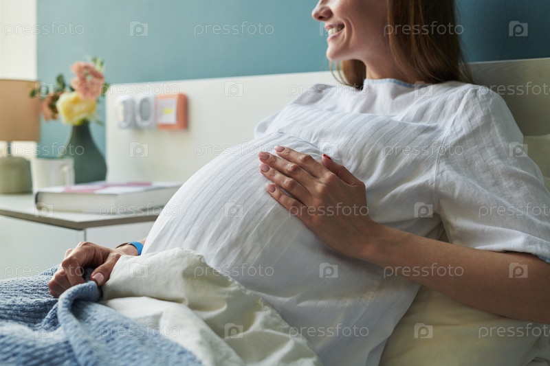 Молодая взрослая женщина улыбается, отдыхая в больничной постели Беременна