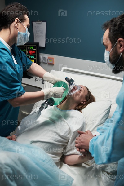 Женщина среднего возраста получает кислородную поддержку от медицинской команды в больнице