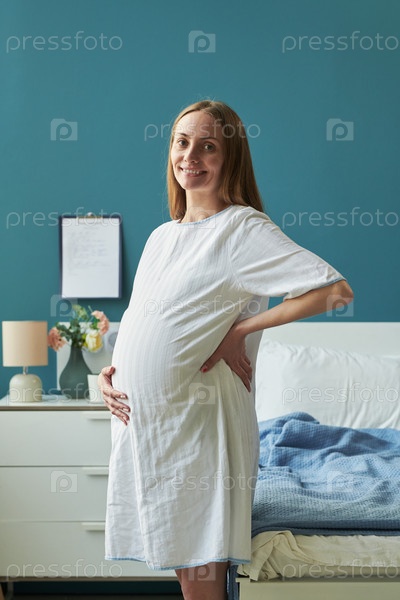 Портрет молодой взрослой женщины, улыбающейся в то время как она держит беременный живот