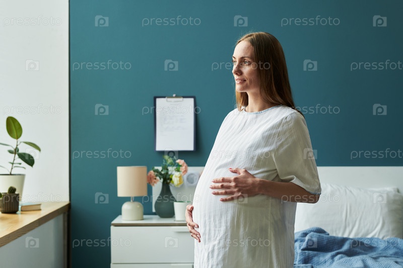 Молодая взрослая женщина держит беременный живот, стоящий в помещении