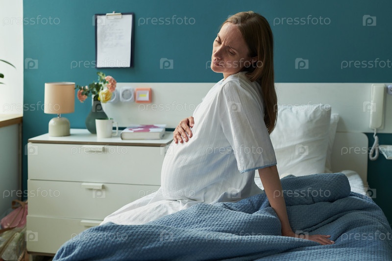 Беременная молодая женщина испытывает трудовые схватки в больничной комнате