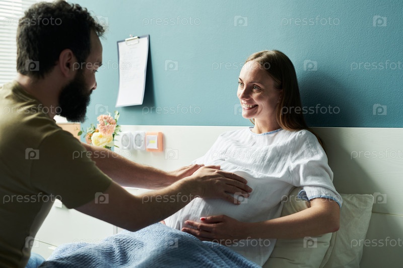 Молодой взрослый мужчина поддерживает беременную женщину в больничной постели