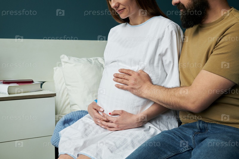 Беременная женщина сидит с бородатым мужчиной, держащим ее живот