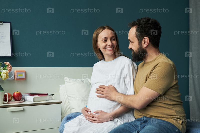 Беременная женщина улыбается, пока ее партнер прикасается к животу в больничной комнате
