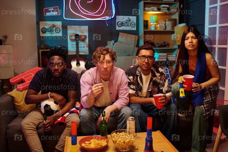 Группа молодых мультиэтнических друзей смотрят телевизор и едят закуски