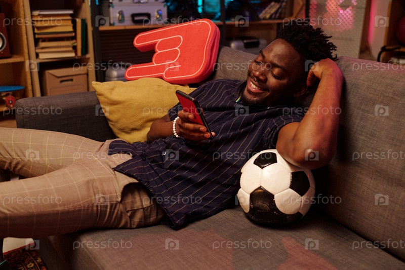 Молодой взрослый чернокожий мужчина отдыхает на диване, используя смартфон и улыбается