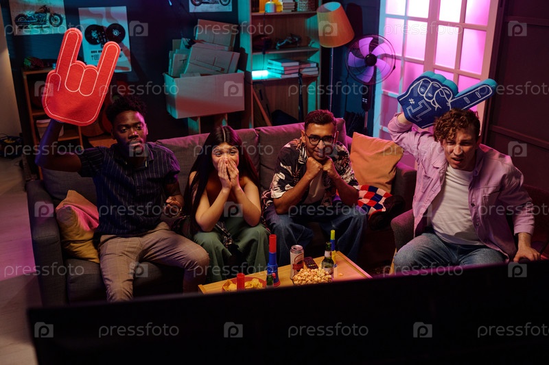 Разнообразные молодые взрослые смотрят спортивную игру и болеют с волнением
