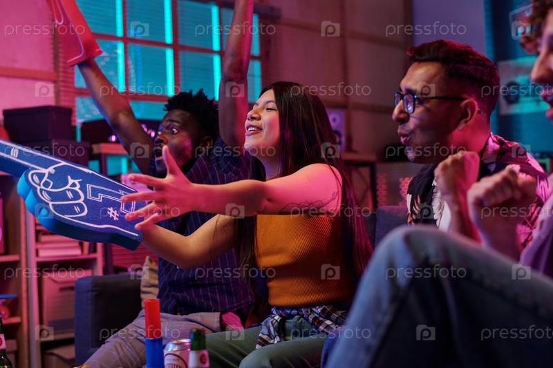 Разнообразные молодые взрослые радуются и празднуют, наблюдая за спортивными играми в помещении