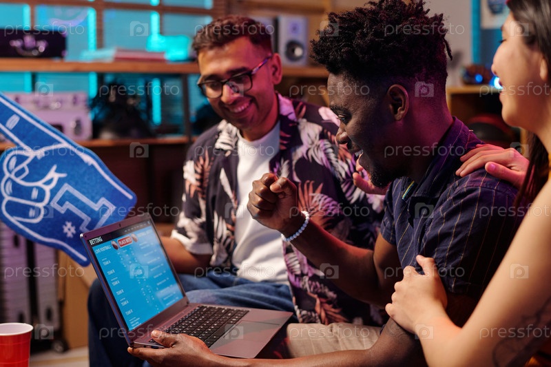Молодые мультиэтнические друзья празднуют онлайн-спортивные ставки и выигрывают вместе