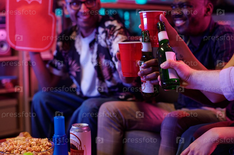 Группа молодых взрослых мужчин, выпивающих напитки и празднующих в помещении вместе