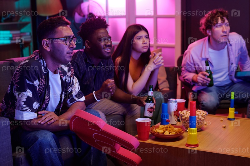 Разнообразные молодые взрослые смотрят спортивную игру и болеют в гостиной