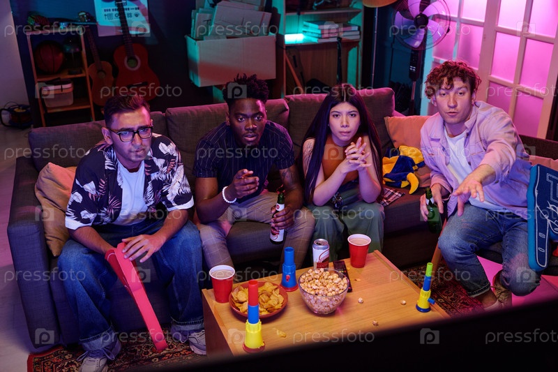 Разнообразные молодые взрослые смотрят спортивную игру и реагируют с волнением в помещении