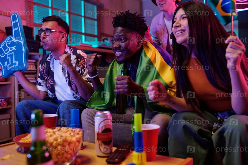 Мультиэтнические молодые взрослые празднуют спортивные мероприятия и наслаждаются напитками в помещении