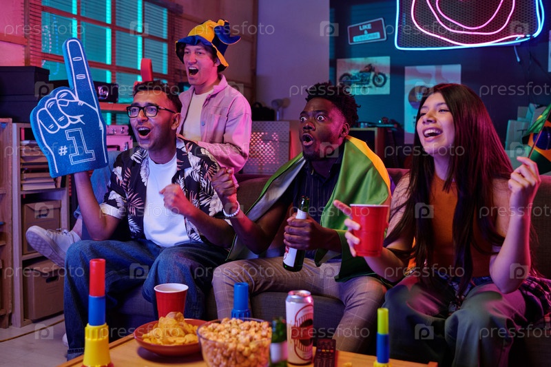 Мультиэтнические молодые взрослые реагируют на спортивные матчи и празднуют с напитками