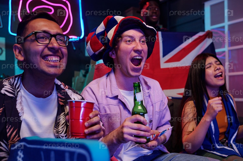 Разнообразные молодые взрослые болеют и смотрят спортивную игру в праздничной атмосфере