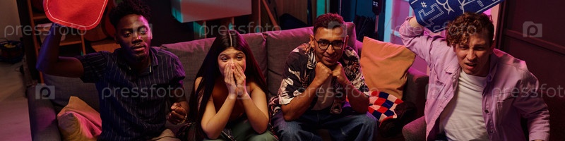 Разнообразные молодые взрослые смотрят спортивную игру, болеют и реагируют на диване