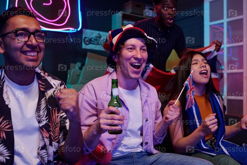 Разнообразные молодые взрослые празднуют спортивную победу, смотря прямую трансляцию