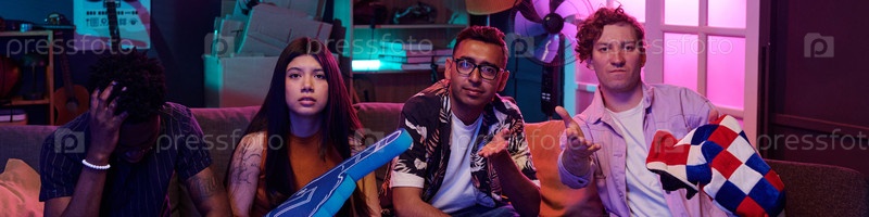 Различные молодые взрослые реагируют разочарованно, наблюдая за спортивными играми в помещении