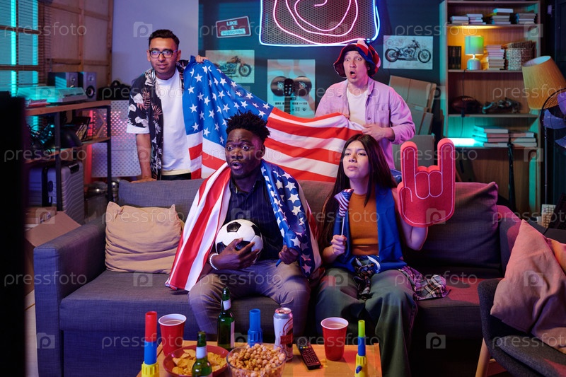 Разнообразные молодые взрослые смотрят футбольный матч и болеют за американский флаг