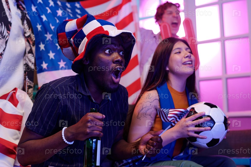 Молодой чернокожий мужчина и молодая женщина смотрят футбольный матч празднуют победу