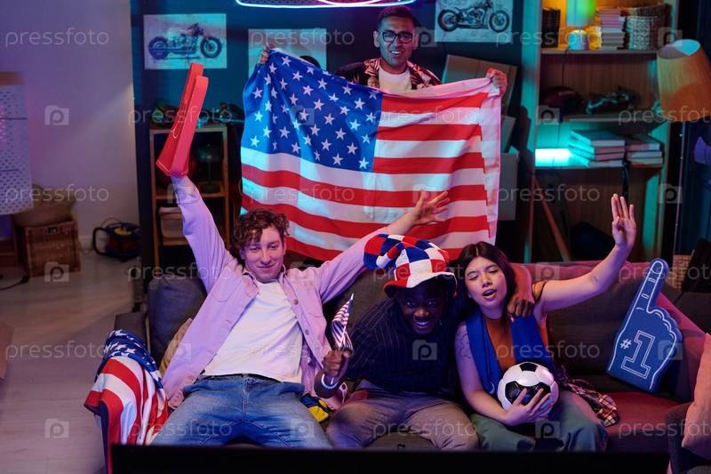 Разнообразные молодые взрослые празднуют спортивную победу, наблюдая за игрой в помещении