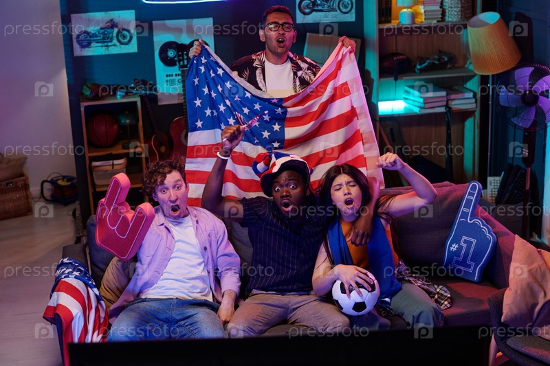 Мультиэтнические молодые взрослые реагируют на спортивный матч, держа американский флаг в помещении