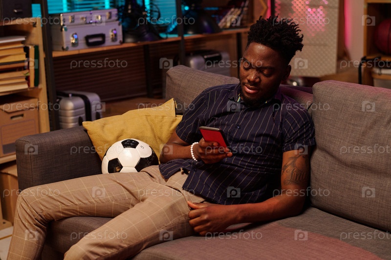Молодой взрослый чернокожий мужчина отдыхает на диване, используя смартфон дома