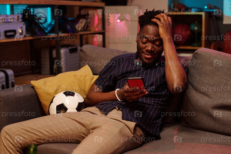 Молодой взрослый чернокожий мужчина улыбается, читая сообщение на смартфоне в помещении