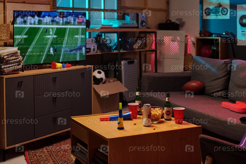 Гостиная показывает неузнаваемых людей, смотрящих футбольный матч по телевизору