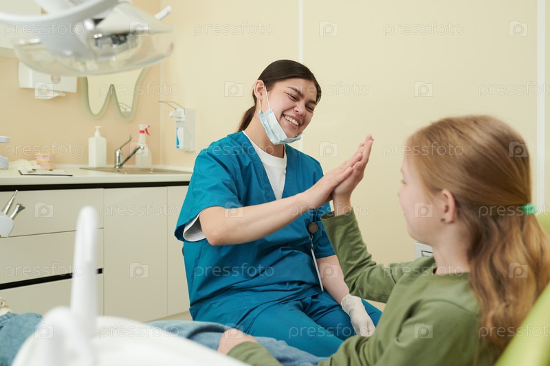 Молодая стоматолог-женщина дает пятерку улыбающемуся детскому пациенту