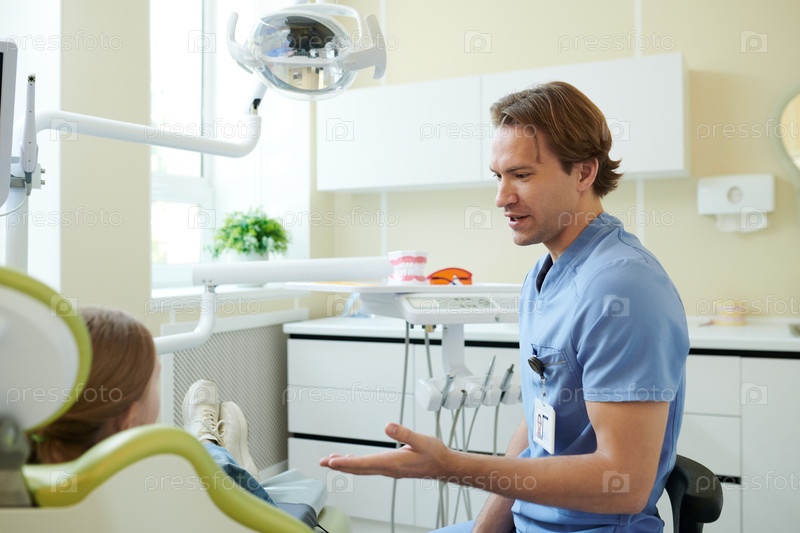 Молодой взрослый мужчина стоматолог консультирует женщину-пациента в клинике