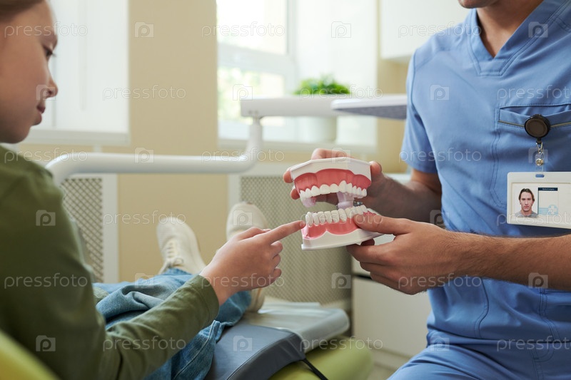 Обучение стоматологической гигиены от молодого взрослого мальчика-стоматолога
