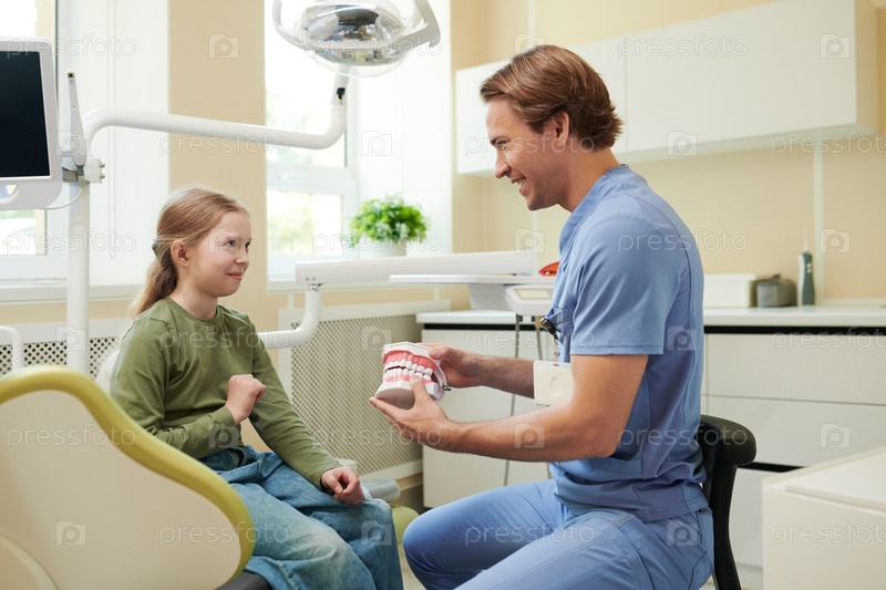 Стоматолог показывает зубную модель улыбающемуся ребенку-пациенту мужчины