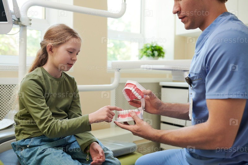 Девушка учится стоматологической гигиене у молодого взрослого мужчины-стоматолога в клинике