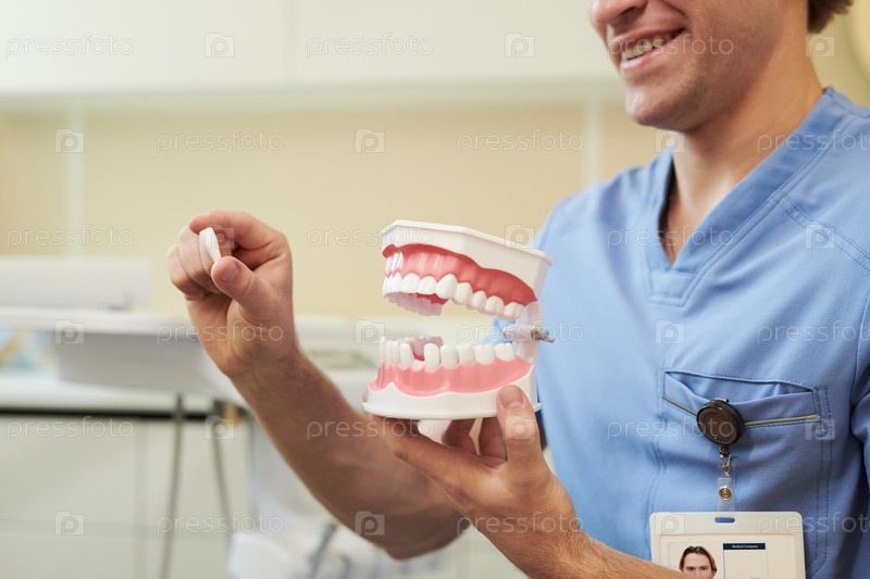 Молодой взрослый мужчина демонстрирует зубную гигиену, используя модель зубов