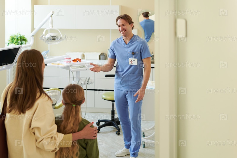 Стоматолог приветствует мать и молодую девочку-пациента в клинике Мужчина