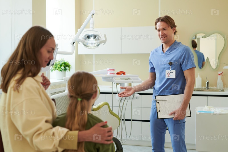 Стоматолог приветствует мать и дочь в современной стоматологической клинике Мужчина