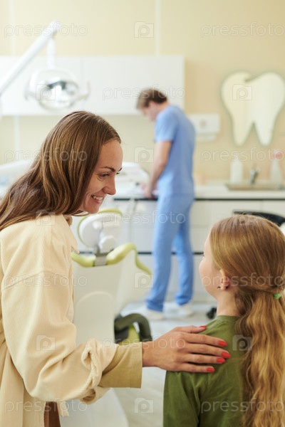 Женщина улыбается, утешая молодую девушку у стоматолога