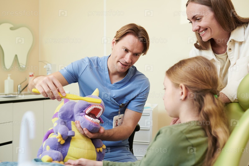 Стоматолог учит молодую девочку зубной гигиене с помощью игрушечного динозавра