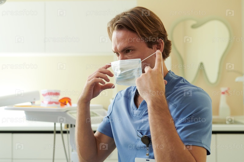 Молодой взрослый мужчина регулирует маску для лица в условиях стоматологической клиники
