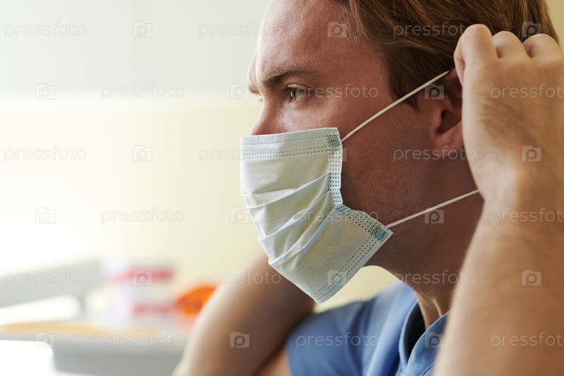 Молодой взрослый мужчина, носящий медицинскую маску в условиях здравоохранения