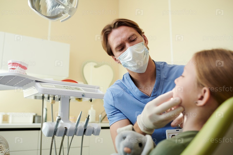 Стоматолог осматривает рот молодой девушки-пациента мужчины
