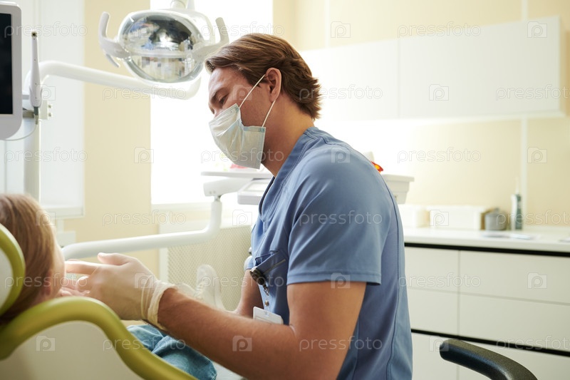 Молодой взрослый мужчина-стоматолог осматривает пациента в современной стоматологической клинике