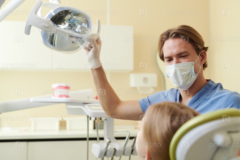 Молодой взрослый мужчина-стоматолог, осматривающий детского пациента в стоматологической клинике